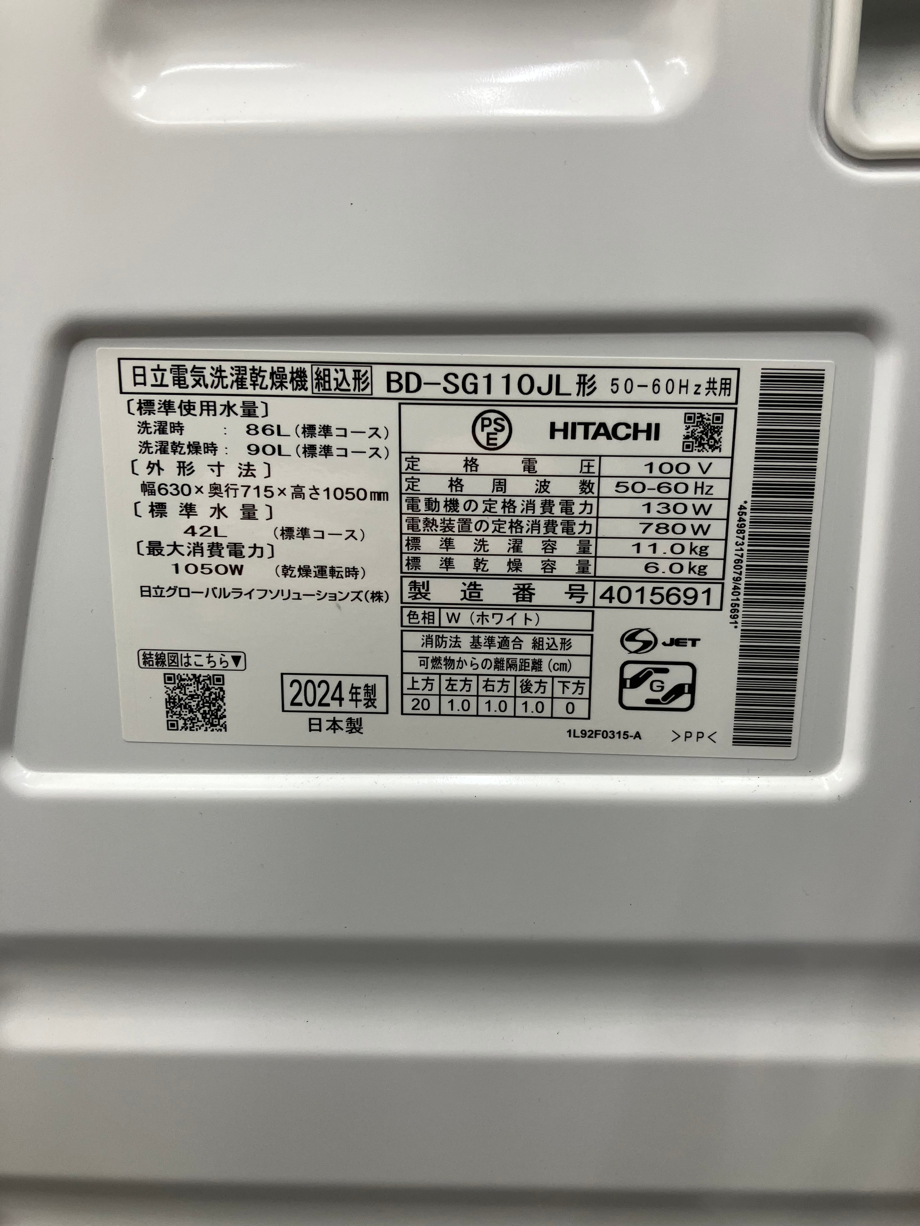 ★東京都内 配送設置無料/店舗直渡し可★2024年製 美品★日立【 ドラム式洗濯機 洗11kg/乾6kg 】BD-SG110JL