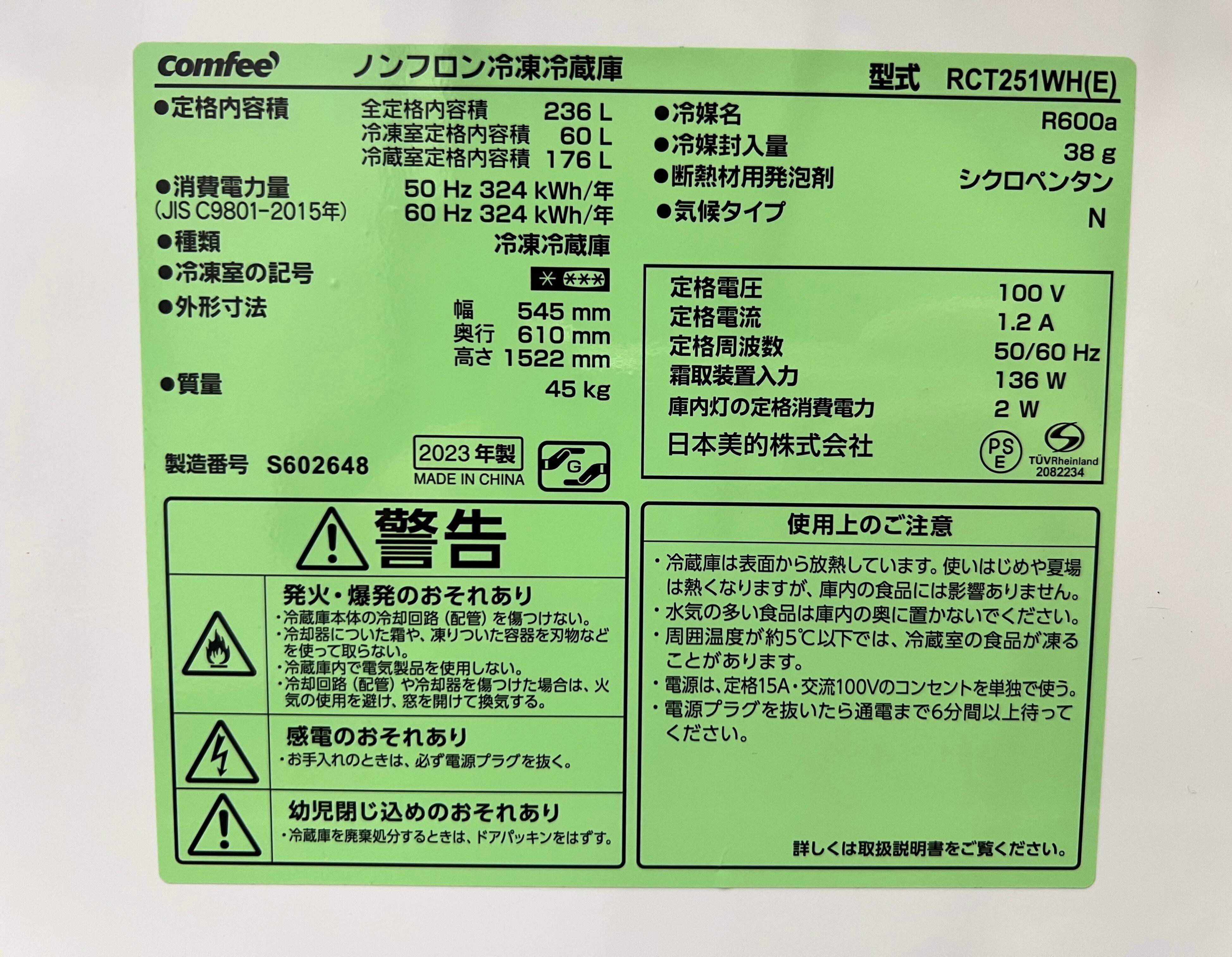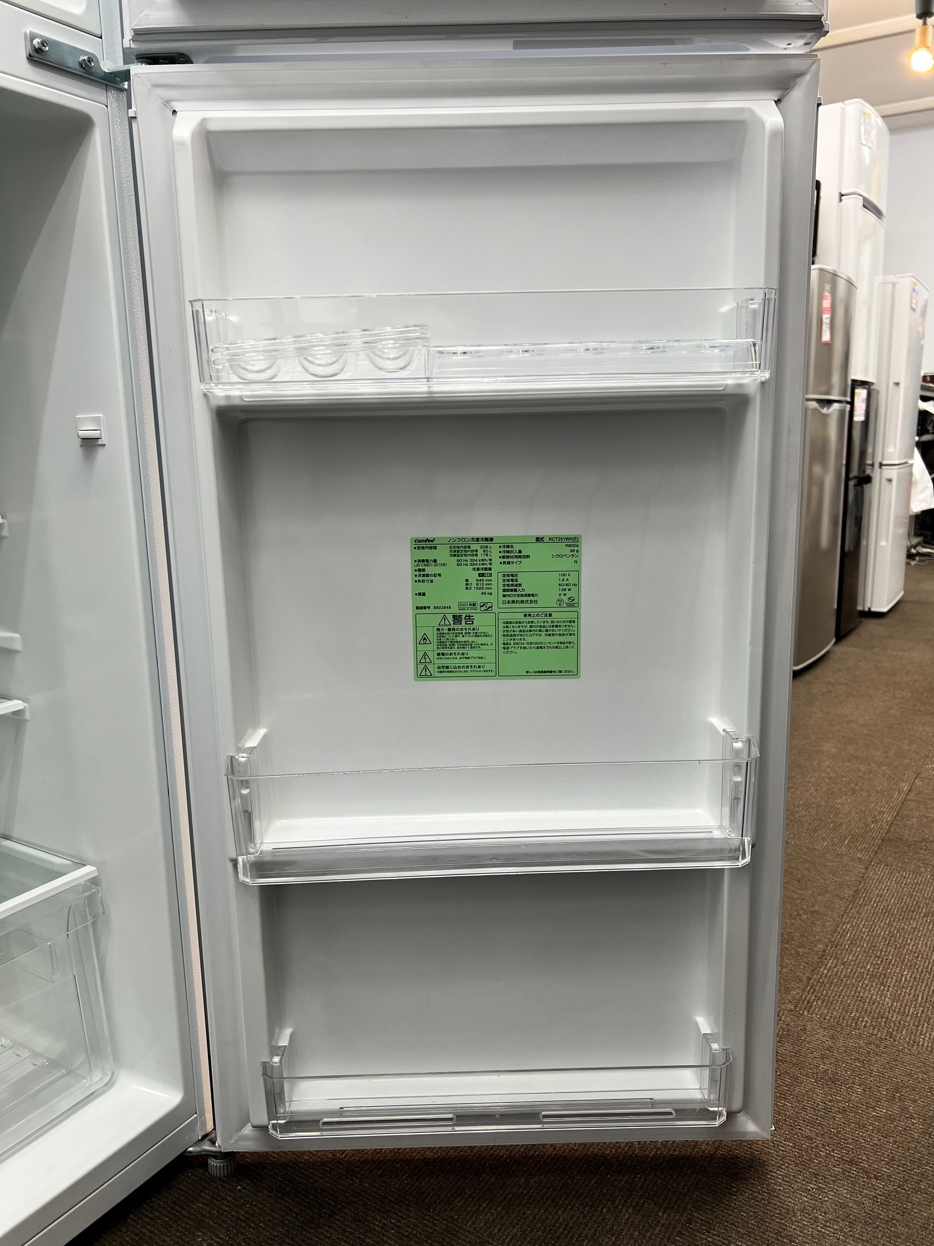 ★東京都内 配送設置無料/店舗直渡し可(有料にて遠方配送可)★2023年製★ COMFEE'【 冷蔵庫 236L 自動霜取り ノンフロン 大容量冷蔵室176L 冷凍機能 幅54.5cm 2ドア 一人暮らし ふたり暮らし用 家庭用 取説付き 】RCT251WH(E) ホワイト