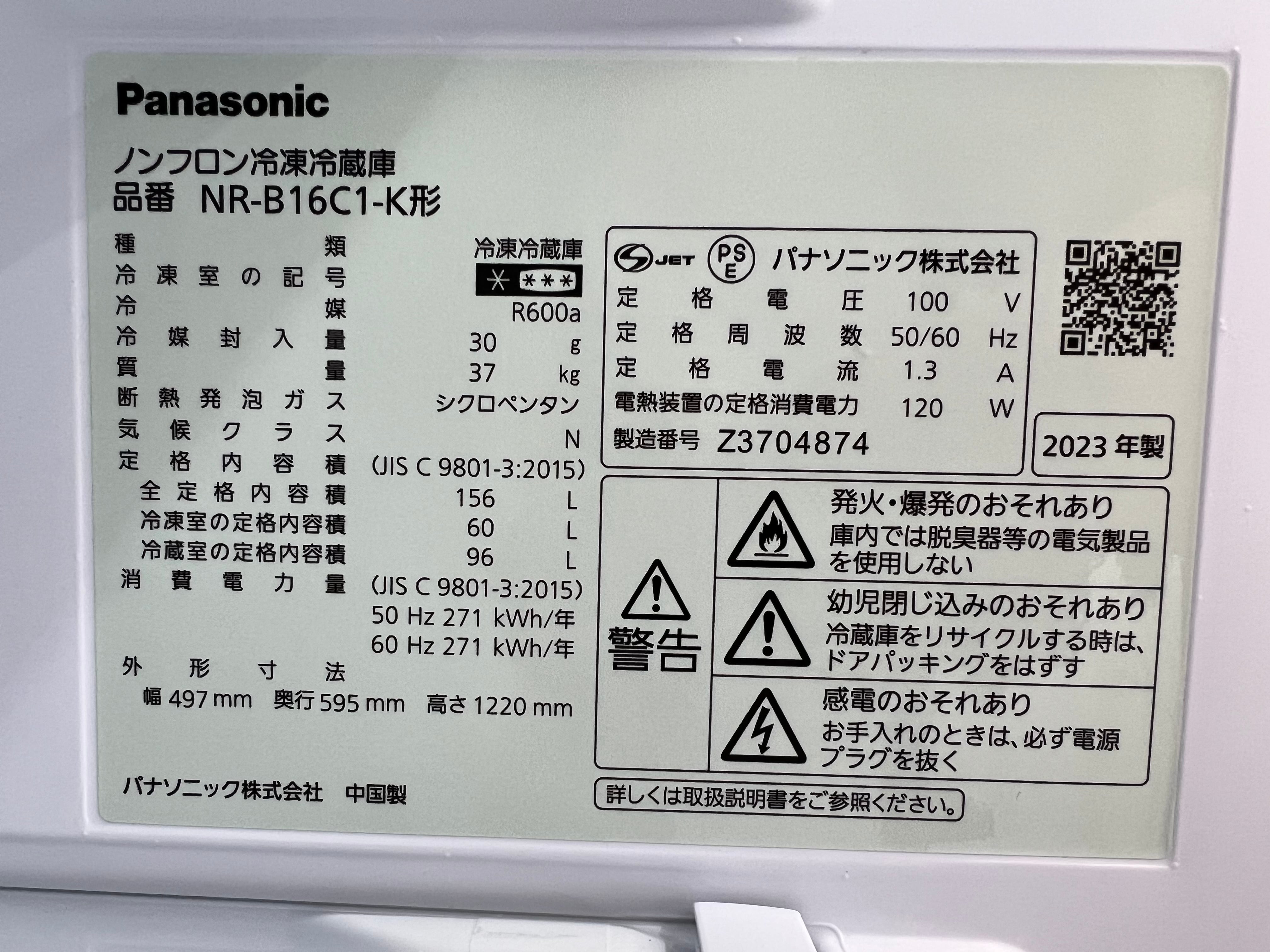 ★東京都内 配送設置無料/店舗直渡し可(有料にて遠方配送可)★2023年製★ Panasonic/パナソニック【 冷蔵庫 パーソナルタイプ 幅49.7cm /156L /2ドア 】マットブラック NR-B16C1-K