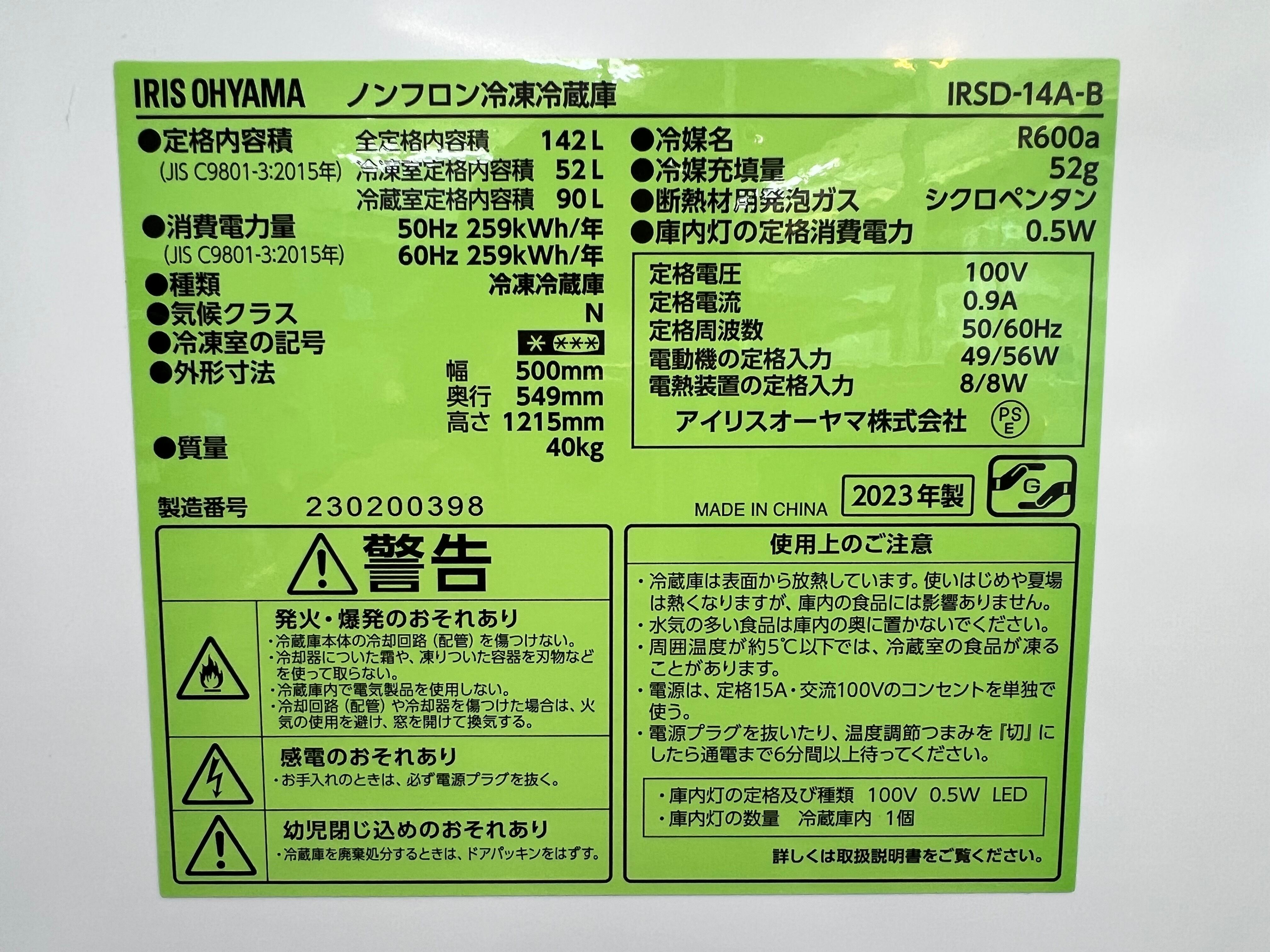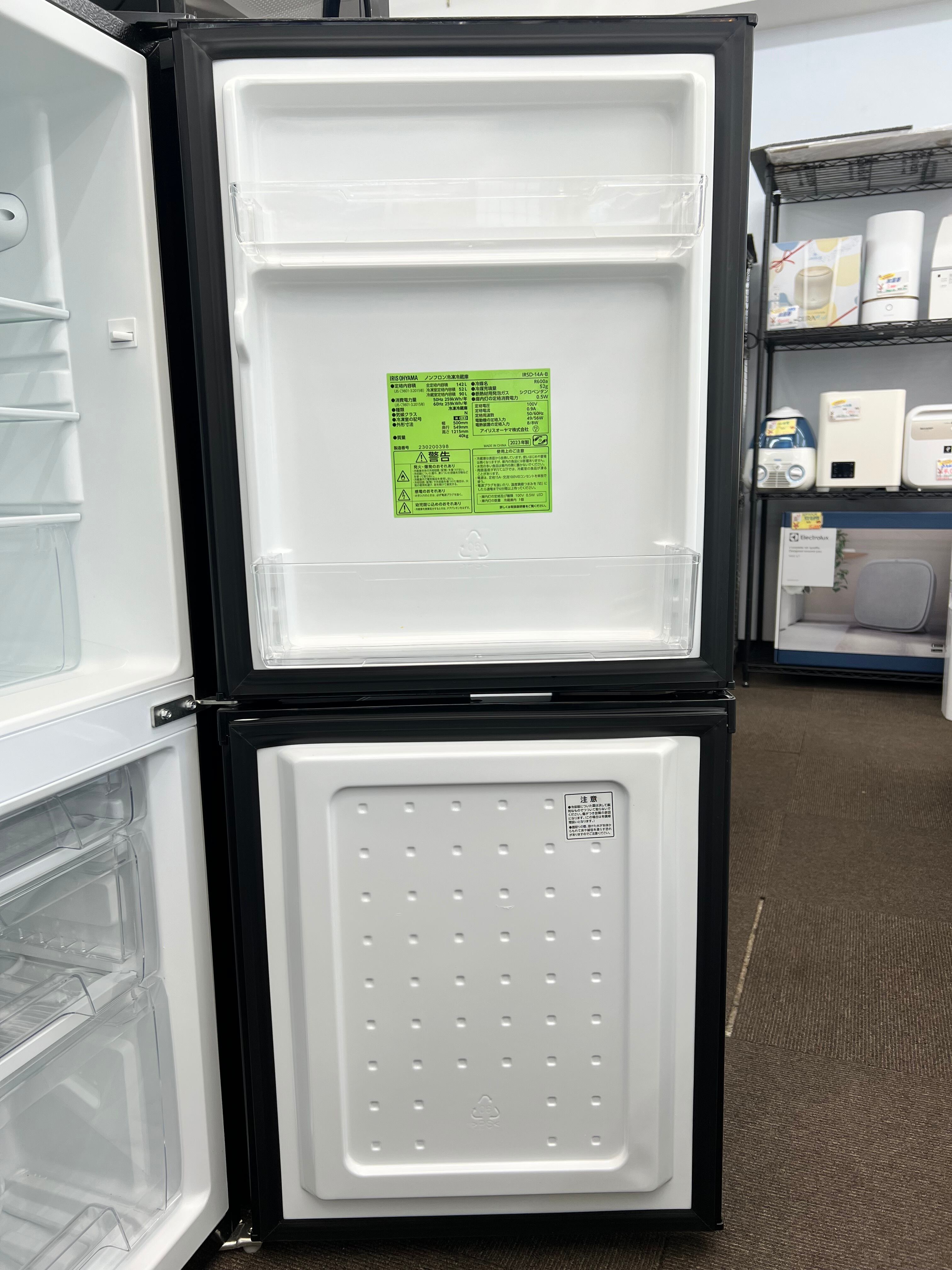 ★東京都内 配送設置無料/店舗直渡し可(有料にて遠方配送可)★2023年製★ アイリスオーヤマ【 冷蔵庫 142L (幅約50cm) 冷凍室52L 右開き 静音 】ブラック IRSD-14A-B