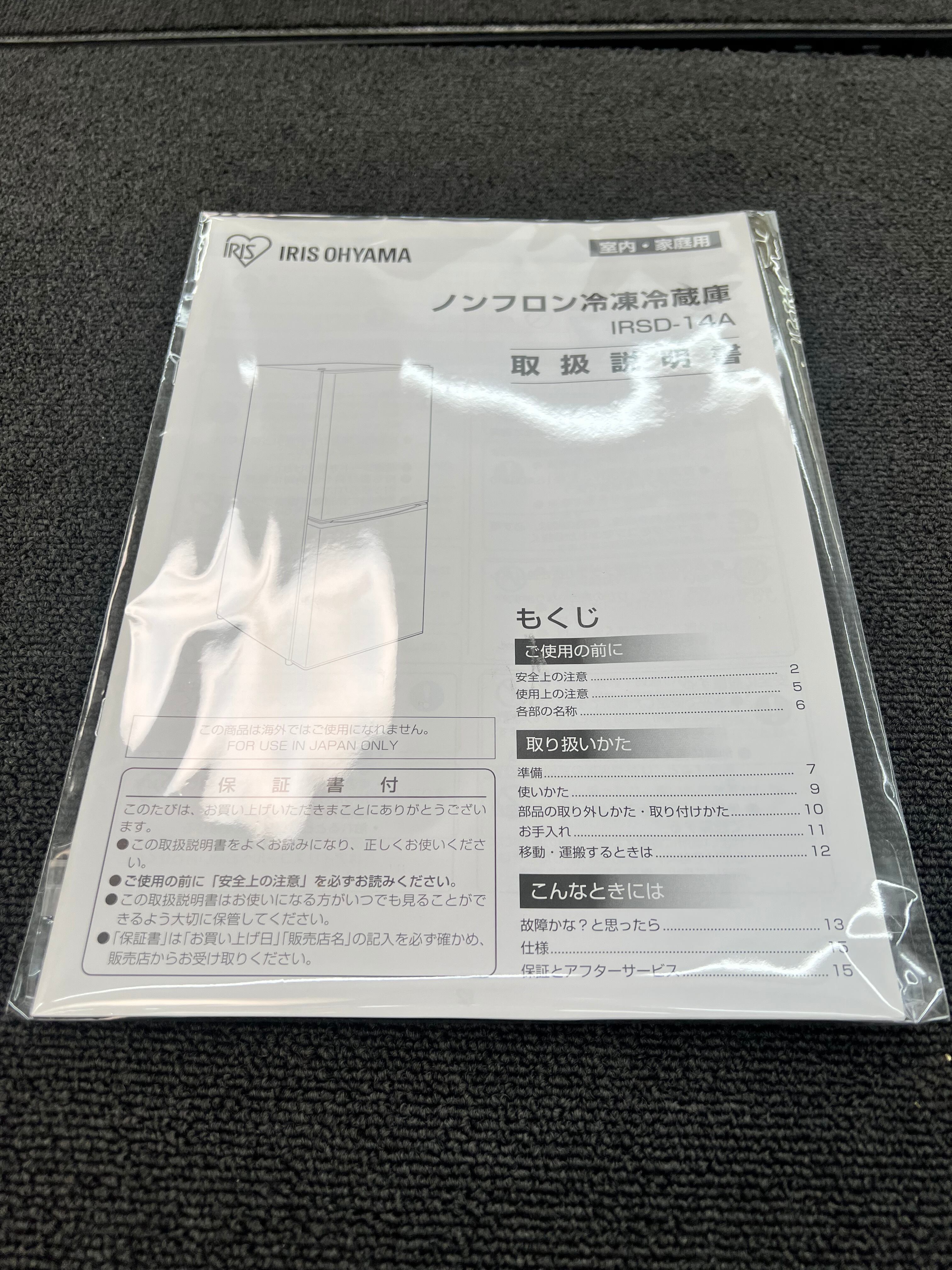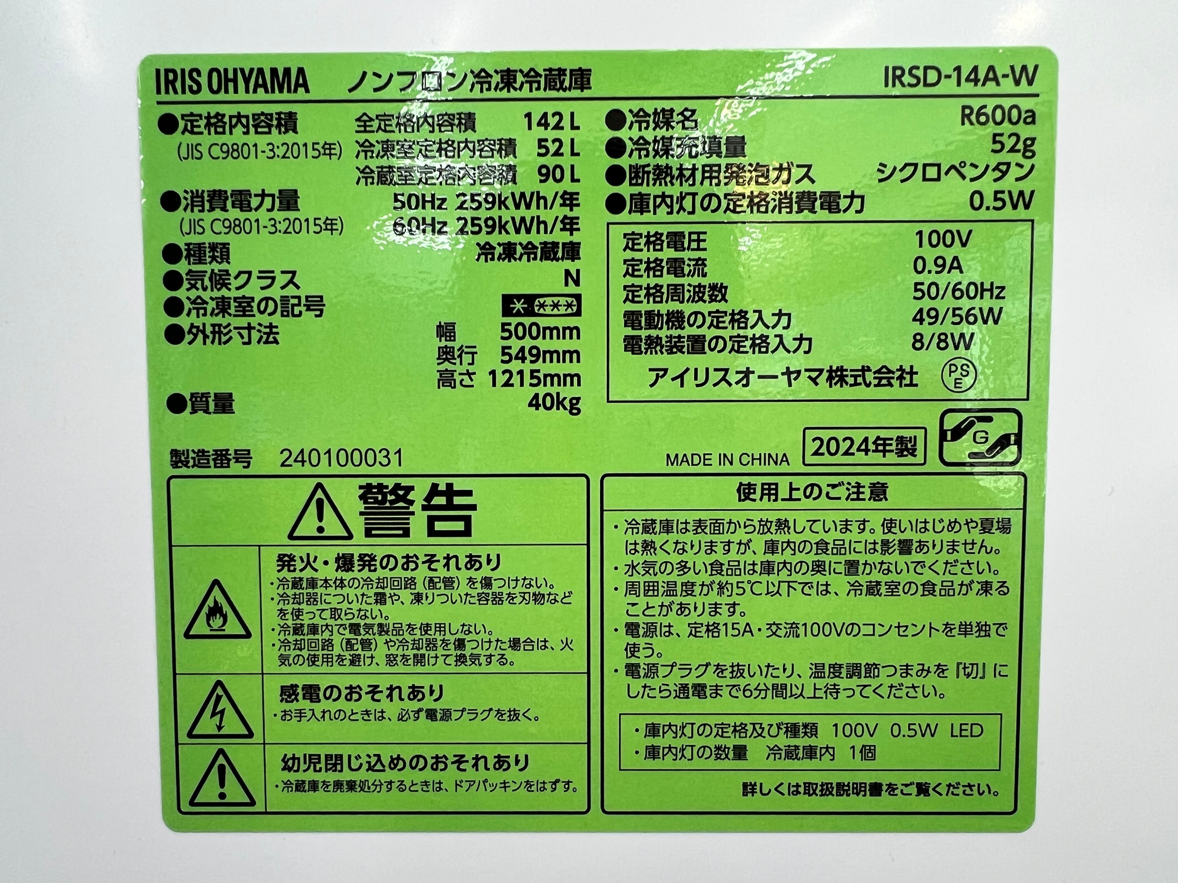 ★東京都内 配送設置無料/店舗直渡し可(有料にて遠方配送可)★2024年製★ アイリスオーヤマ【 冷蔵庫 142L (幅約50cm) 冷凍室52L 取説付き 】ホワイト IRSD-14A-W