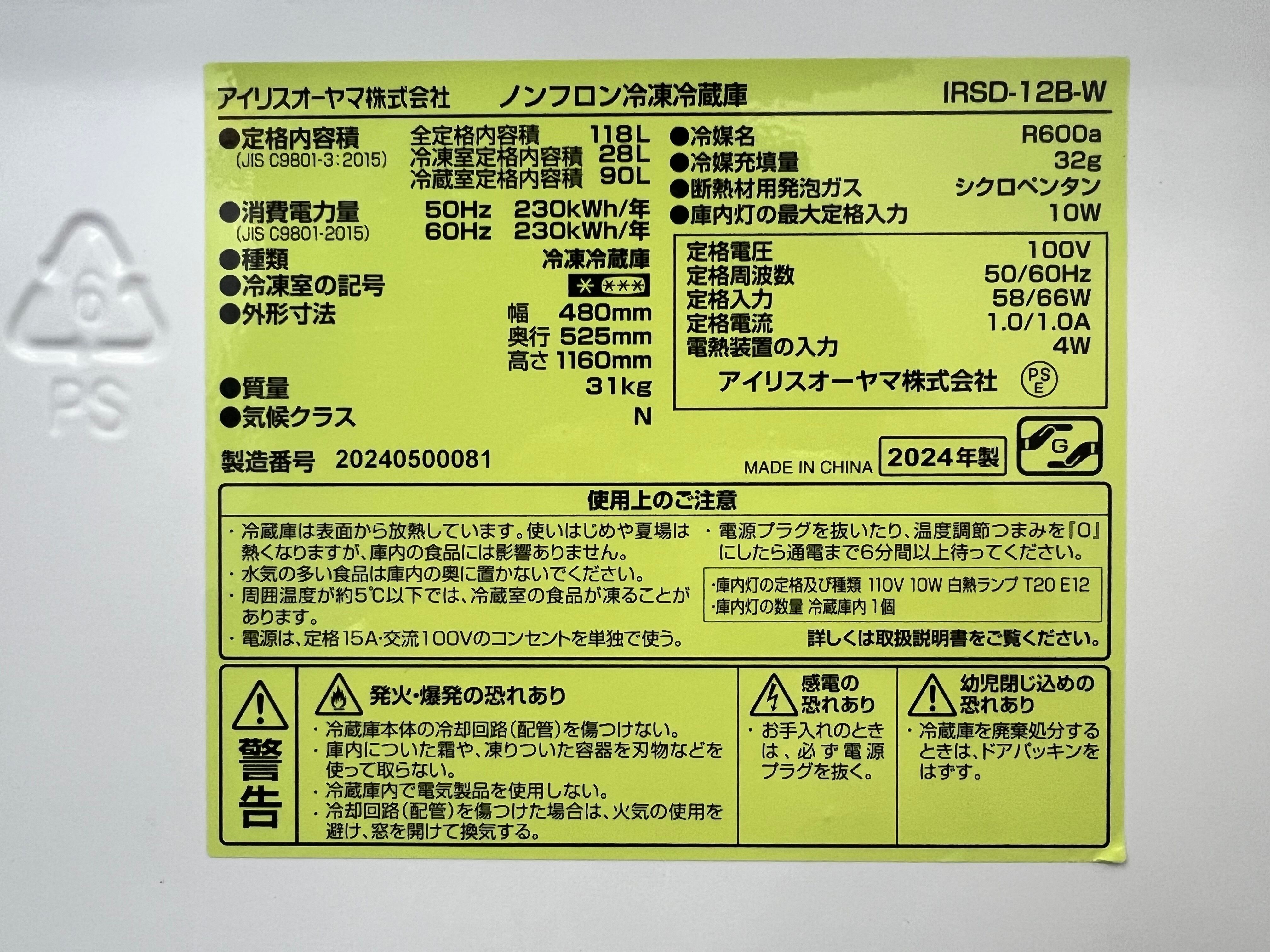 ★東京都内 配送設置無料/店舗直渡し可(有料にて遠方配送可) ★2024年製★ アイリスオーヤマ【 冷蔵庫 118L 小型 一人暮らし 2ドア 幅48cm 】IRSD-12B-W
